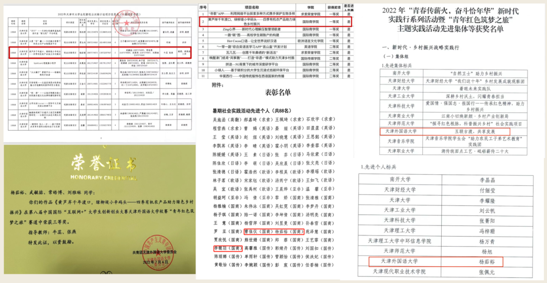 团队获评“新时代• 乡村振兴战略实践行”天津市先进集体标兵。实践团负责人杨茹裕同学统筹协调能力强,有效保障了实践活动顺利开展,获评天津市先进个人标兵。张燕老师获评市级优秀指导教师。
