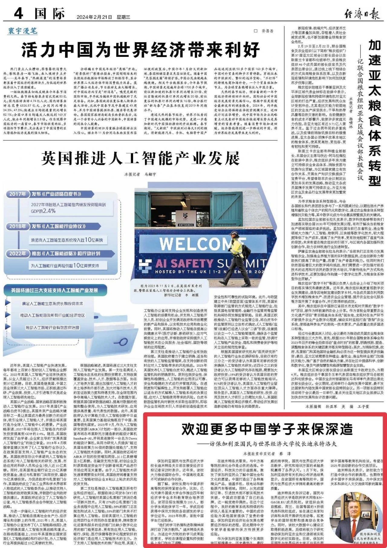 迪米特洛夫告诉记者,国民与世界经济大学是欧洲学术网络ENGAGE.EU成员院校。该组织由来自挪威、荷兰、法国等国的9所领先商科院校组成,旨在通过共享知识库和共同开展研究活动等,拓宽员工的国际视野和提高综合竞争力。同时,该校大数据中心建设正取得积极进展,后续将致力于研究推动保加利亚农业和交通领域实现数字化的切实路径。目前,保加利亚国民与世界经济大学正与另外两家中国高等教育机构洽谈,希望在2025年启动新的合作交流项目。